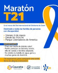 En el marco del Día Internacional del Síndrome de Down, te invitamos a compartir una tarde llena de alegría y unión en la Maratón T21, destinada a todas las familias de personas con discapacidad.