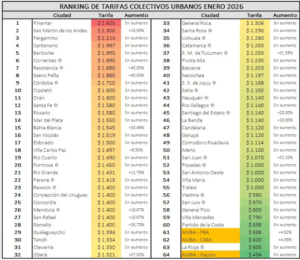 El nuevo ranking nacional de tarifas urbanas difundido por la Asociación Argentina de Empresarios del Transporte Automotor (AAETA) ubicó a San Juan en el puesto 49 sobre más de 60 ciudades relevadas, con un valor de $1.070 por viaje. La medición toma el cuadro vigente a enero de 2026 y permite observar las diferencias tarifarias entre provincias y municipios del país.